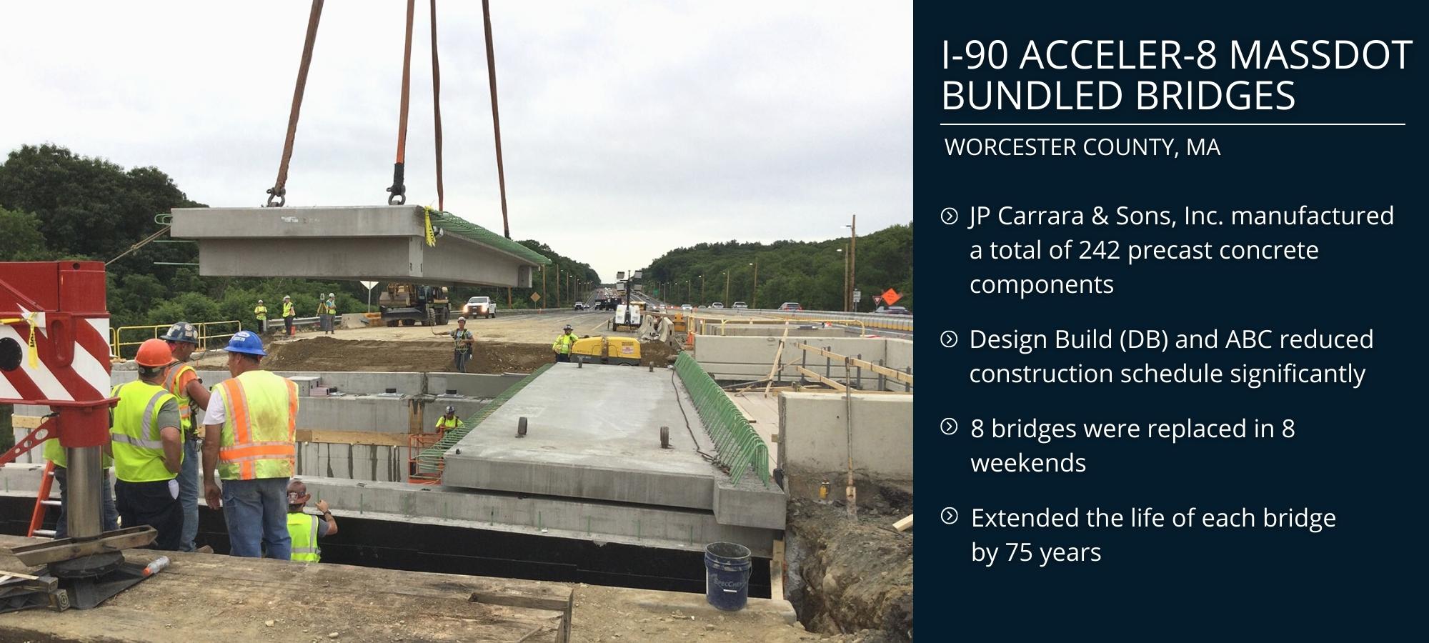 The Massachusetts Department of Transportation chose ABC to complete the I-90 Acceler-8 Bundled Bridges project in Worcester County, demonstrating the use of precast concrete elements to provide safer and more efficient construction, reducing the schedule from several years to ONLY 8 weekends.