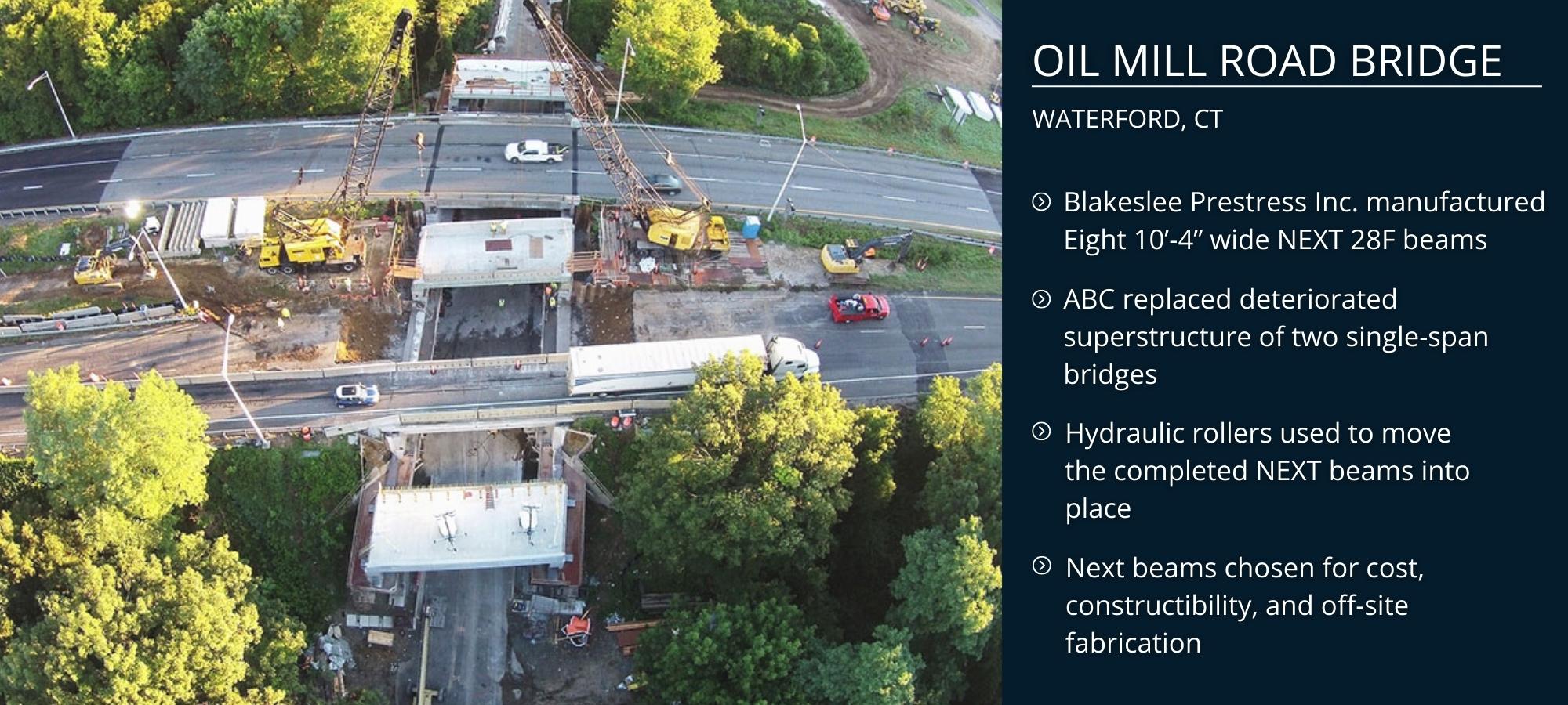 The damaged superstructures of two-single span bridges that carry Interstate 95 over Oil Mill Road in Waterford, CT, were replaced using accelerated bridge construction (ABC) technology. The project was the first in the state to use hydraulic rollers to transport the final beam/slab assembly into place on the tracks.