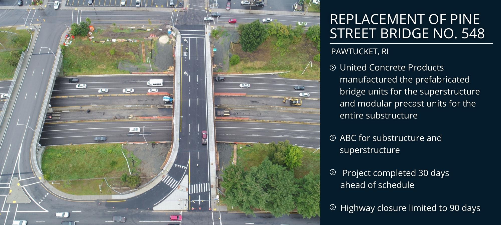 To speed up the replacement of Pine Street Bridge No. 548, The Rhode Island Department of Transportation employed accelerated bridge construction methods utilizing precast concrete components and pre-manufactured bridge units. Compared to conventional methods, the ABC approach rapidly constructed a new bridge deck and saved significant time.