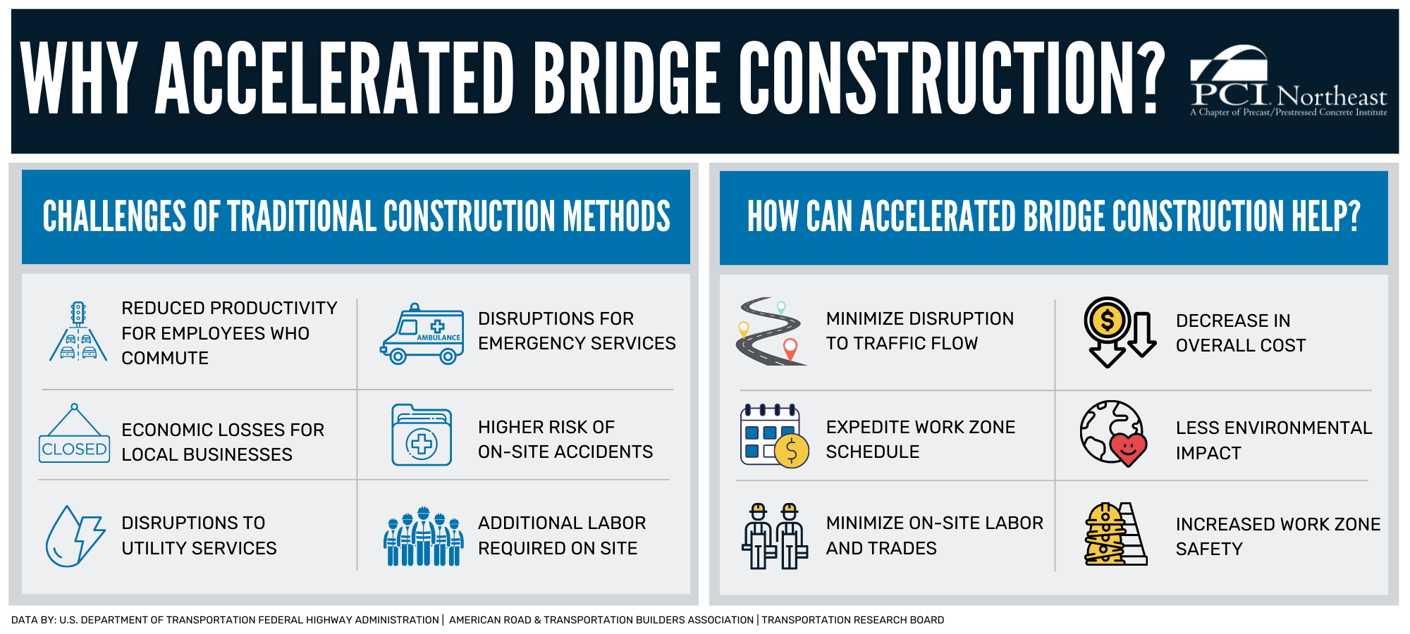 As the chapter representing PCI-Certified precast concrete producers in the region, PCI Northeast has developed various resources to aid in designing, engineering, and constructing bridges utilizing ABC methods.